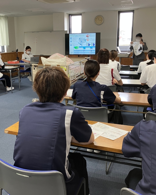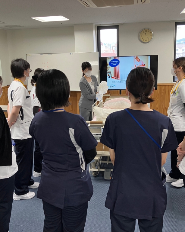 講師は皮膚・排泄ケア認定看護師(WOCナース)の河村主任です。排泄のしくみ、おむつの装着、褥瘡のケアや予防方法について学びました。リハビリスタッフや看護補助者も一緒に参加し、多職種連携でのケアの重要性を共有しています。