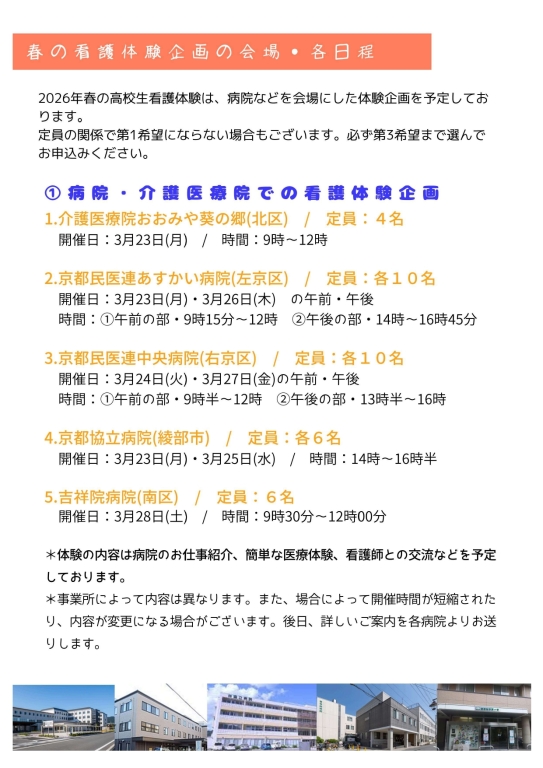 京都民医連では看護師を目指している、興味があるという高校生の皆さんを対象に看護体験を開催します!